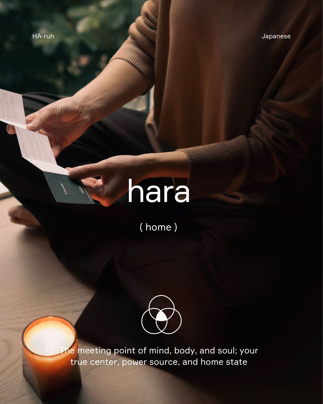 The mood-enhancing botanical in HARA is sandalwood. Rich woody layers with coffee and caramel nuances create a deeply grounding experience. Sandalwood helps restore stability, calm awareness, and a serene sense of balance — bringing you back to your center. The scent is warm and meditative, like quiet embers glowing within.